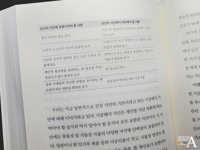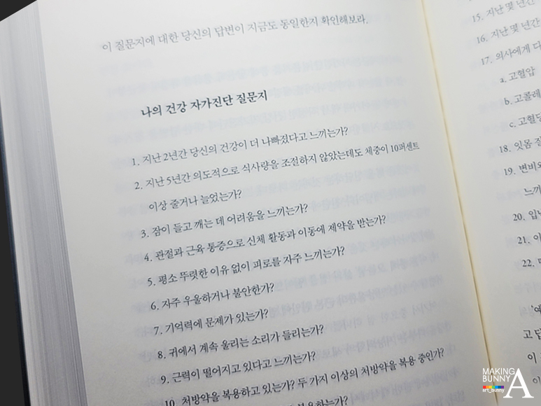 어쩌면 앞서 의학의 실패를 불러온 이유처럼 이런 변화는 개인에게도 귀찮음과 불편함을 야기할지도 모른다. 하지만, 만성질환을 친구처럼 평생 불편을 감수하며 가져갈 것이 아니라면 저자가 제안한 개인맞춤형 프로그램을 통해 하나씩 변화를 일상에 적용해 보기를 추천한다.