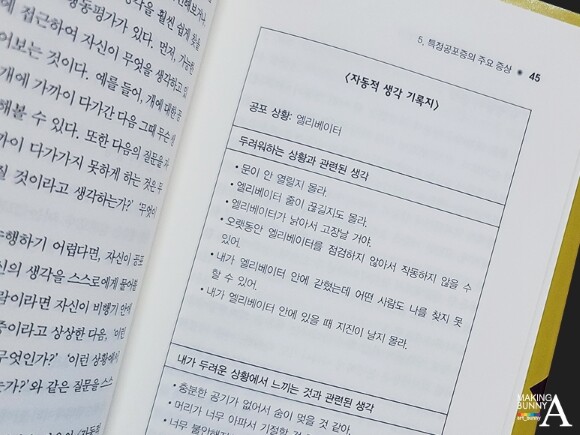 '이런 상황에서 나를 두렵게 하는 것은 무엇인가?', '이런 상황에서 무슨 일이 벌어질 것이라고 생각하는가?'와 같은 질문을 스스로에게 해보고 자신의 생각을 다음의 <자동적 생각 기록지>에 기록해 보면 더욱더 공포를 직면하는 데 도움을 얻을 수 있다.