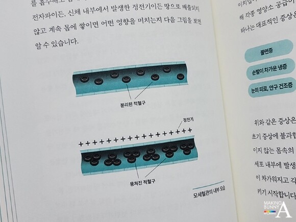 혈액에 다량의 마이너스 전자를 공급하면 적혈구의 표면이 마이너스 전하를 띠게 돼 서로 밀어내며 달라붙지 않고 낱개의 포도알처럼 뿔뿔이 흩어져 모세혈관을 쉽게 통과한다. 따라서 혈액순환이 잘 돼 손발이 따뜻해지고 세포에 영양 공급이 원활해져 질병이 치유되는 쪽으로 진행된다.