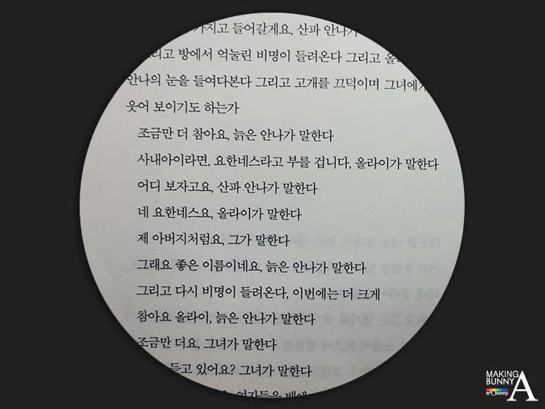 그러던 중 다인이 소양리에 온 건 충동적인 결정이었다. 이제 할머니가 소양리에 없다는 건 다인도 잘 알고 있었지만, 그럼에도 어쩐지 다시 이곳을 방문하고 싶었다.