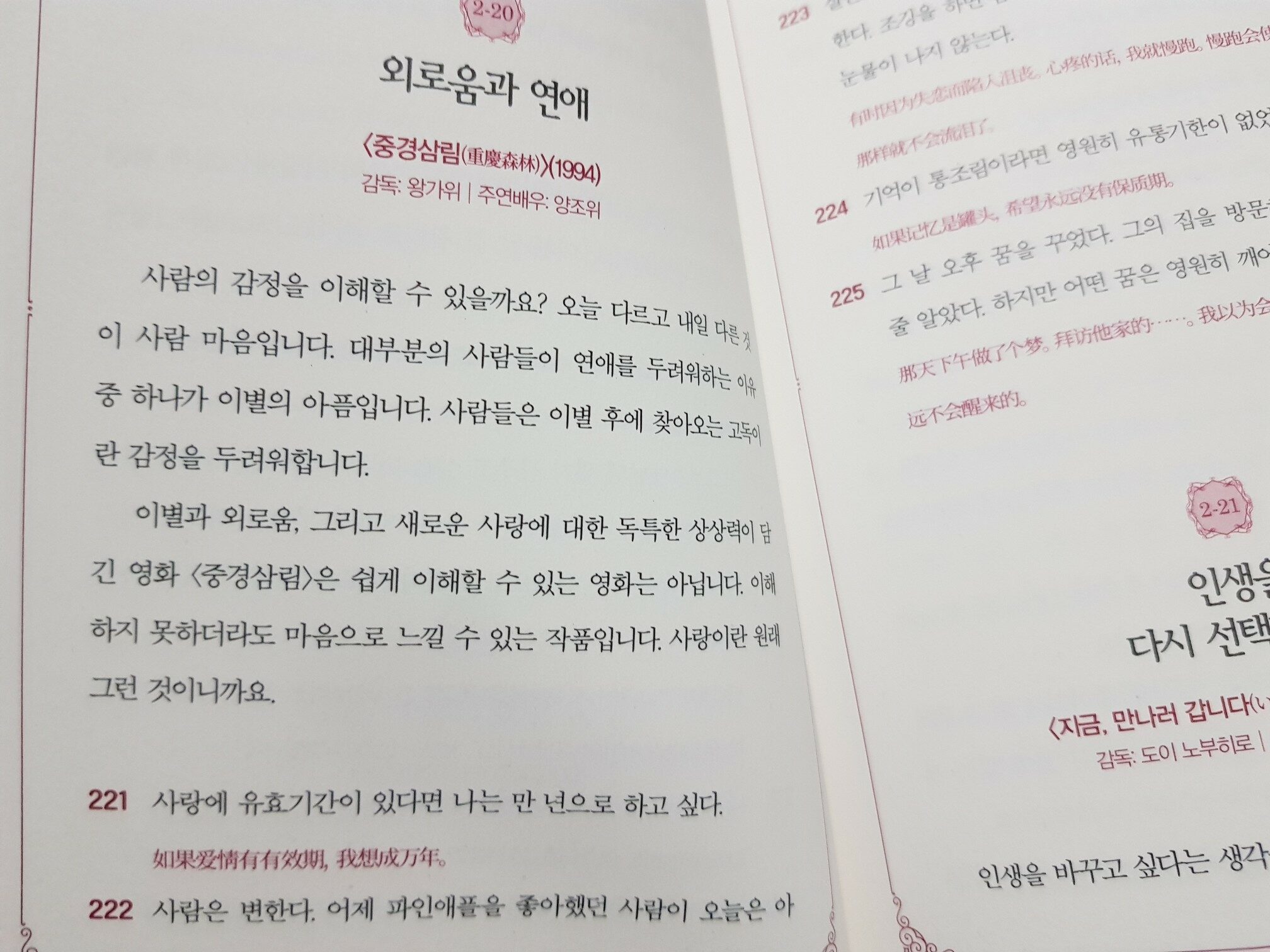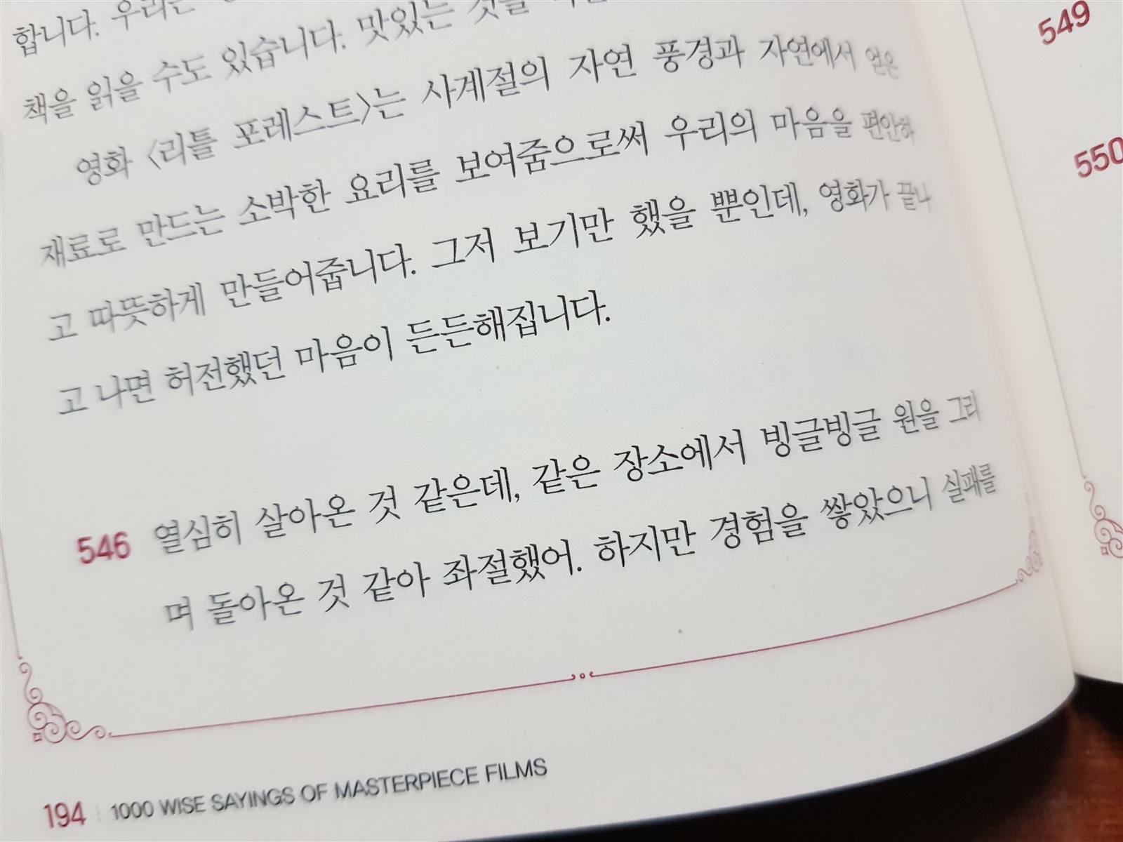 우리나라 영화를 비롯해 미국, 영국, 일본, 중국, 프랑스등등 세계 각지의 영화를 소개하고 주요 장면의 명대사를 만나보게 되니 몰랐던 영화는 한번쯤 보고 싶어지기도 하고 마음에 와닿는 문장은 멋지게 적어서 책상앞에 붙여두고 싶어집니다. 또한 영화속 명대사는 기억하고 있지만 이미 너무 오래전에 보았던 영화들을 추억하는 시간이 되기도 하구요.