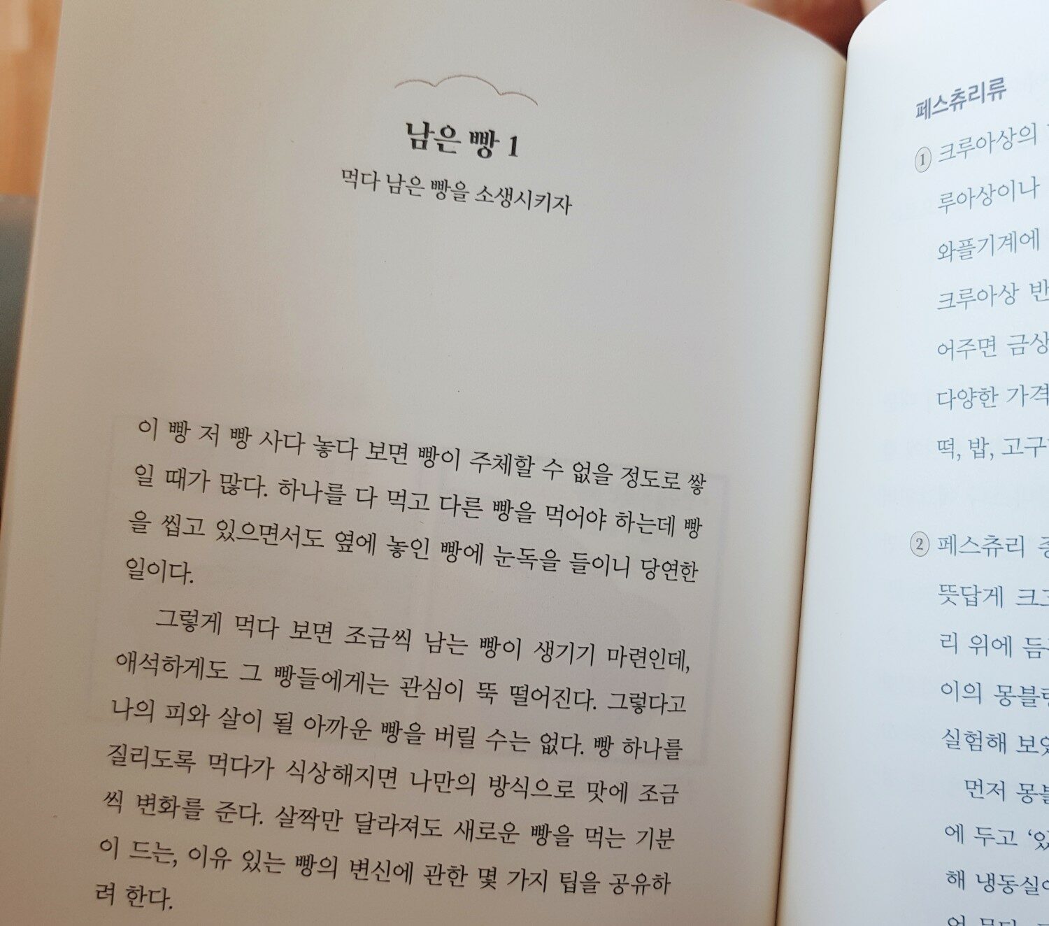 어느 할머니의 고마운이에게 전하는 단팥빵, 조금 고급스럽지만 사랑할 수 밖에 없는 마카롱, 조가비를 닮은 마들렌, 조선인이 처음 맛본 카스텔라, 여름 빵캉스로 즐겨먹던 타르트, 눈앞에 아른거려서 매일 하나씩 사간다는 버터 프레츨, 재료를 1파운드씩 넣고 만드는 파운드케이크, 금전운을 빌며 선물하는 피낭시에, 실수로 베이킹파우더를 깜빡해 만들어진 브라우니, 중국의 만두가 호빵이 된 사연, 입 한번 데어보지 않은 사람이 없는 호떡, 슬픈 전설이 있지만 그래도 찾는 붕어빵, 학창시절 매점에 달려가 사먹던 모카빵, 옛시절의 맛을 살린 옥수수빵등 빵마다 참 다양하고 의미있는 에피소드들이 나의 추억까지 소환해주는 글이다.