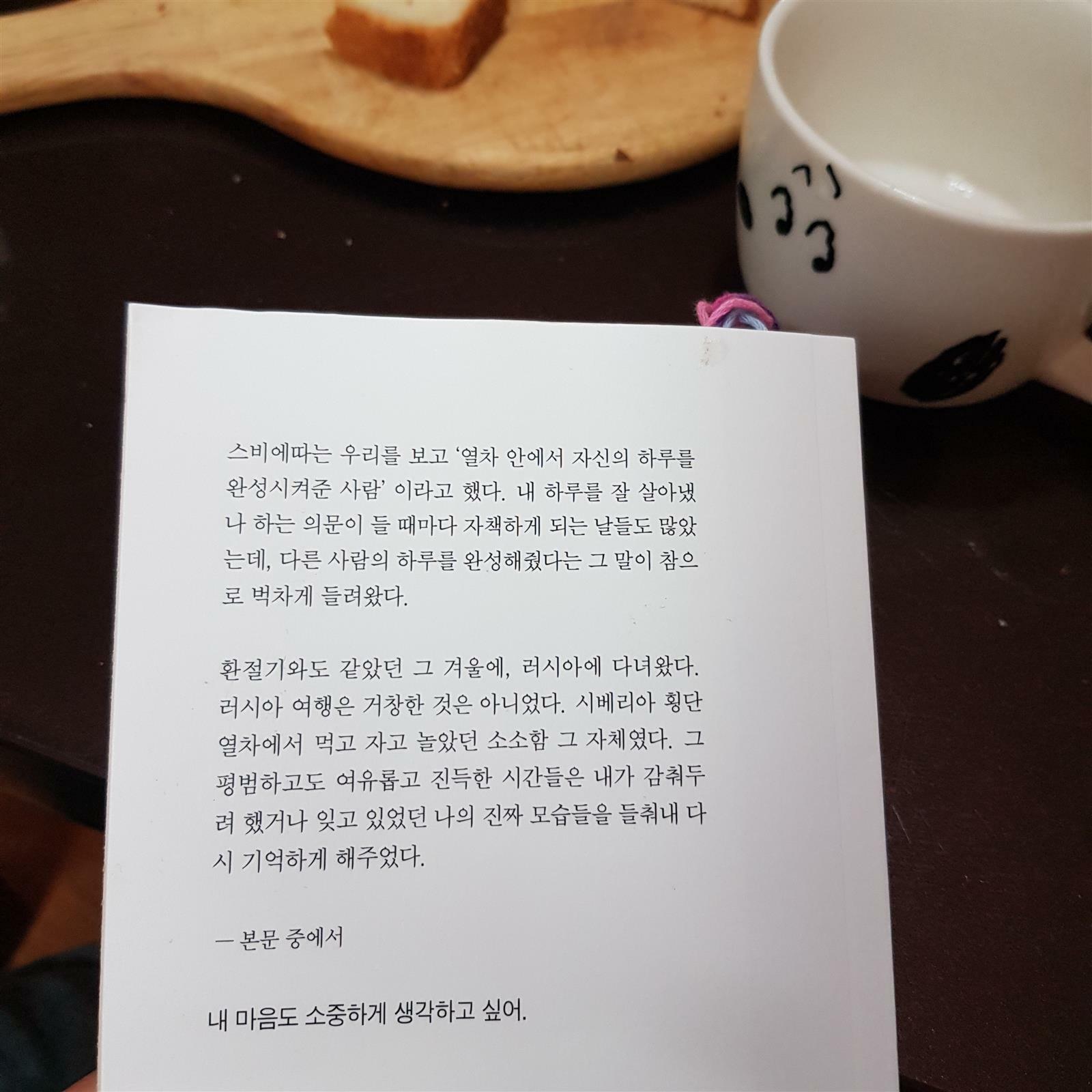 낯선 풍경이 주는 놀라움과 설레임은 오히려 내가 알던 곳으로의 추억을 회상하게도 하고 기차를 찾아 타야하는 순간까지 걱정과 근심을 덜지 못해 안절부절하는 모습들까지 여행에서 겪었던 나의 이야기와 사뭇 다르지 않아 공감하게 됩니다. 낯선 도시의 풍경이 멋진건 사실이지만 거대한 바이칼 호수 앞애서 한강을 떠올리는 저자의 마음처럼 요즘들어 우리 한강의 아름다움이 새삼 더 기분좋게 여겨지구요.