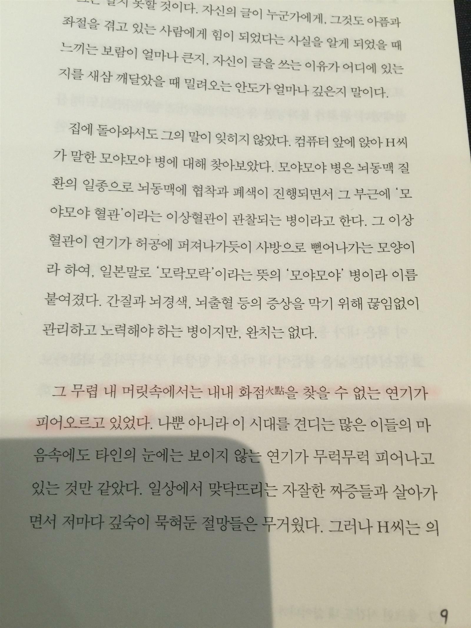 나도 요즘 무언가 `화점`이 없는 삶을 살고 있는 것 같다. 아무튼 이 모야모야병을 앓고있으면서도 삶을 힘차게 (더욱) 힘차게, (그 누구보다 더욱) 힘차게 살아가는 분에게 경의를 표한다.