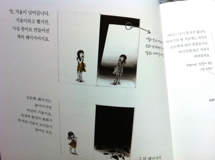 페이지의 넘기는 중앙선을 이용해서 현실과 환상을 넘나드는 요소로 활용했다는 점이 굉장히 신선하면서 충격적이었다.