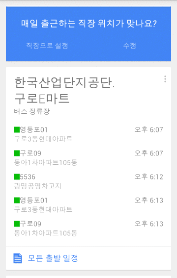 이직한 직장에 4일 째 출근하는 날이였다. Android에서 Google Now가 나에게 현재 위치가 직장 맞느냐고 묻는다. Google은 내가 출근 시간에 이 곳으로 이동하고, 저녁에 다시 돌아가는 패턴을 보고 이 곳을 직장이라고 추론한 것 같다. 물론 나는 그런 패턴으로 이 근처에 온 것이고, 직장이 맞았다.