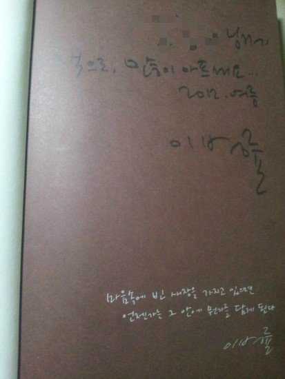 많이 아프세요, 를 먼저 쓰고 책으로를 나중에 써 주었는데, 다른 사람의 후기를 보니 많이 아프세요, 가 가훈이란다. 나는 가훈 같은 것은 단 한번도 걸어보지 않은 집에서 자랐는데. 가훈 부터 이렇게 촉촉하다니. 당신, 너무 이기적인 것 아닙니까 라고 따지고 싶었다. 왠지 부러웠기 때문이다. 태어났을 때부터 문학소년으로 태어난 것만 같아서. 아, 그런데 같은 말을 다른 사람에게도 적어준 걸 보고 잠시 질투. 그러나 책으로가 덧붙여져 있으니 스스로를 위로하자고 다시 나를 다독였다. 사실 싸인회를 할 즈음에 이병률 시인은 무척 지쳐보였고, 그럼에도 한 명 한 명 인사를 하고 원하는 말을 써주려고 하고 했다. 그 모습이 정말 프로 같아서 멋있었다. 아름답고 좋은 글을 쓰는 것도 작가의 일이지만, 그 글을 읽어주는 독자를 소중히 대하는 것 또한 작가의 일이라는 생각이 들었다.