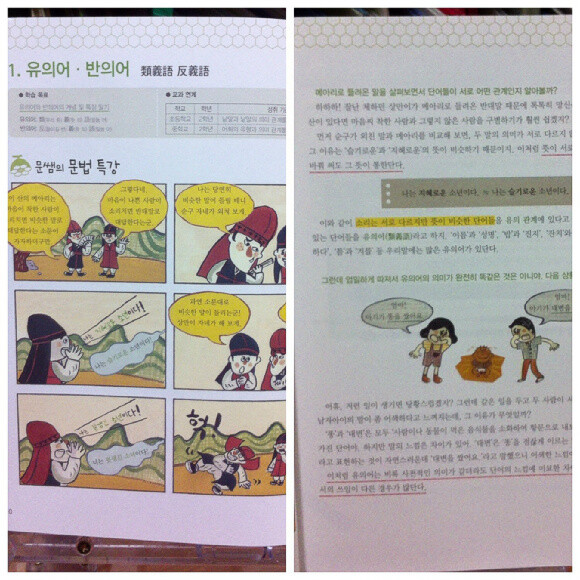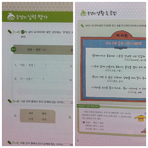 참고로 여기에 나오는 문쌤은 실제 저자가 아니다. 처음에 문쌤이라 해서 저자 성함이 문@@인줄 알았는데 문법쌤의 줄임말이란다. 정체를 알 수 없는 문쌤이지만 설명 하나는 아주 친절하다. 유의어에 대한 설명을 하면서 덧붙인 삽화를 봐도 그러하다. "아기가 대변을 봤어요, 아기가 똥을 쌌어요."라고 익숙한(?) 주제에 대해 이야기하여 이해를 돕는다. 문제집이지만 삽화들이 제법 웃기다.