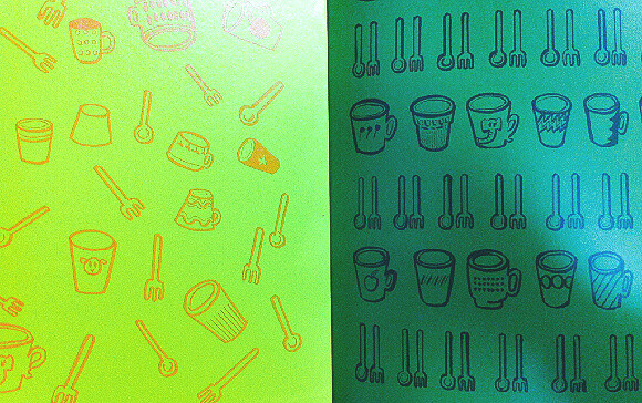 오늘 읽을 이 책에서는 이런 페이지가 있네요. 왼쪽은 숟가락과 포크와 여러 모양의 컵이 여기 저기 놓여 있어요. 반면에 오른쪽 페이지는 컵이 다섯개씩 놓여 있고, 숟가락과 포크는 2개씩 5묶음이 한 줄을 이루고 있네요.