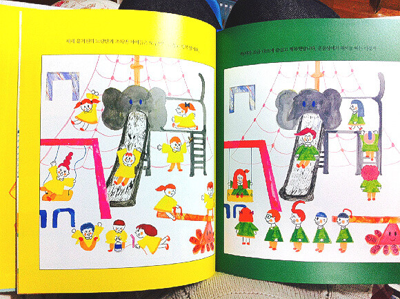 아래 그림을 보니, 노랑반 아이들은 자유롭게 뛰어놀고 있네요. 초록반 아이들은 차례대로 줄을 서고 질서를 지키며 놀고 있어요. 아이들은 담임 선생님을 닮아가지요. 두 선생님의 차이가 가장 잘 나타나는 장면입니다.