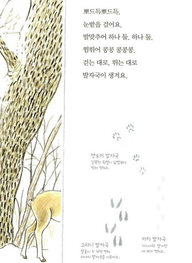아이들만 눈밭을 걷는 건 아니지요. 마치 화가난 표정 같은 멧토끼의 발자국, 사과씨같은 고라니의 발자국, 솔잎 같은 까치 발자국. 발자국을 보며 뭐 닮았나 이야기하는 재미가 쏠쏠합니다.