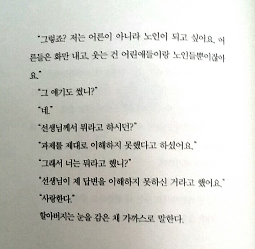 할아버지가 긴 시간을 살아오면서 깨달은 것을 전해주고, 평생을 사랑했으나, 먼저 하늘 나라로 떠난 할머니를 추억한다. 이런 과정에서 손자와의 대화에서 좋은 글귀가 많이 나온다.