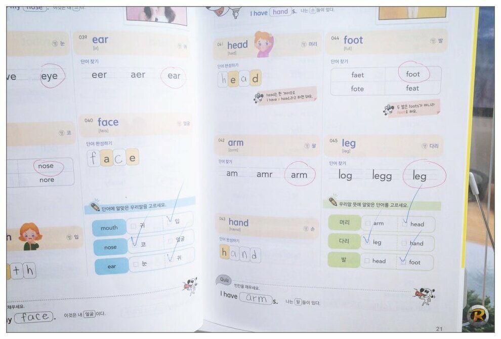 이 교재는 한 권으로 학년별 어휘 800개를 익힐 수 있게 되어 있고, 알파벳만 어느 정도 익숙하면 학년 상관 없이 시작할 수 있는 구성이에요. 단어가 주제별로 묶여 있어서 외울 때도 훨씬 덜 막막했고, 짧은 문장 150개로 기본 문형까지 같이 잡아주는 점도 좋았어요. 3~6학년 영어 교과서 5종을 분석해서 필수 영단어를 정리해놓았다고 하니, 이미 단어를 좀 아는 아이라도 빠르게 복습용으로 쓰기 괜찮겠다 싶었구요.