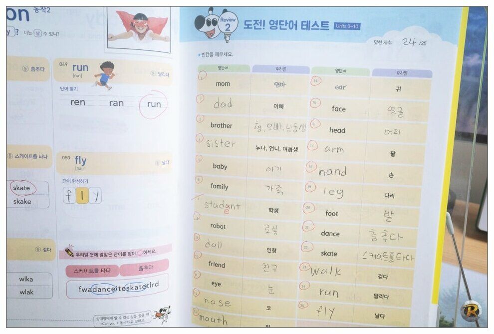 한 달 같이 해보면서 제일 좋았던 건, 단어들이 주제별로 묶여 있다 보니 생활 속에 끼워 넣기 쉬웠다는 점이에요. 과일이나 음식 단원은 장 보거나 밥 차릴 때 단어를 하나씩 말해보게 했고, 동작이나 감정 단원은 아이가 하루 일 얘기할 때 단어를 떠올려보게 했어요. 단어장을 펼치지 않아도 책에서 봤던 단어가 한 번 더 떠오르는 순간이 생기니까, 아이도 "외운다"는 부담이 조금 줄어드는 느낌이 들더라구요.