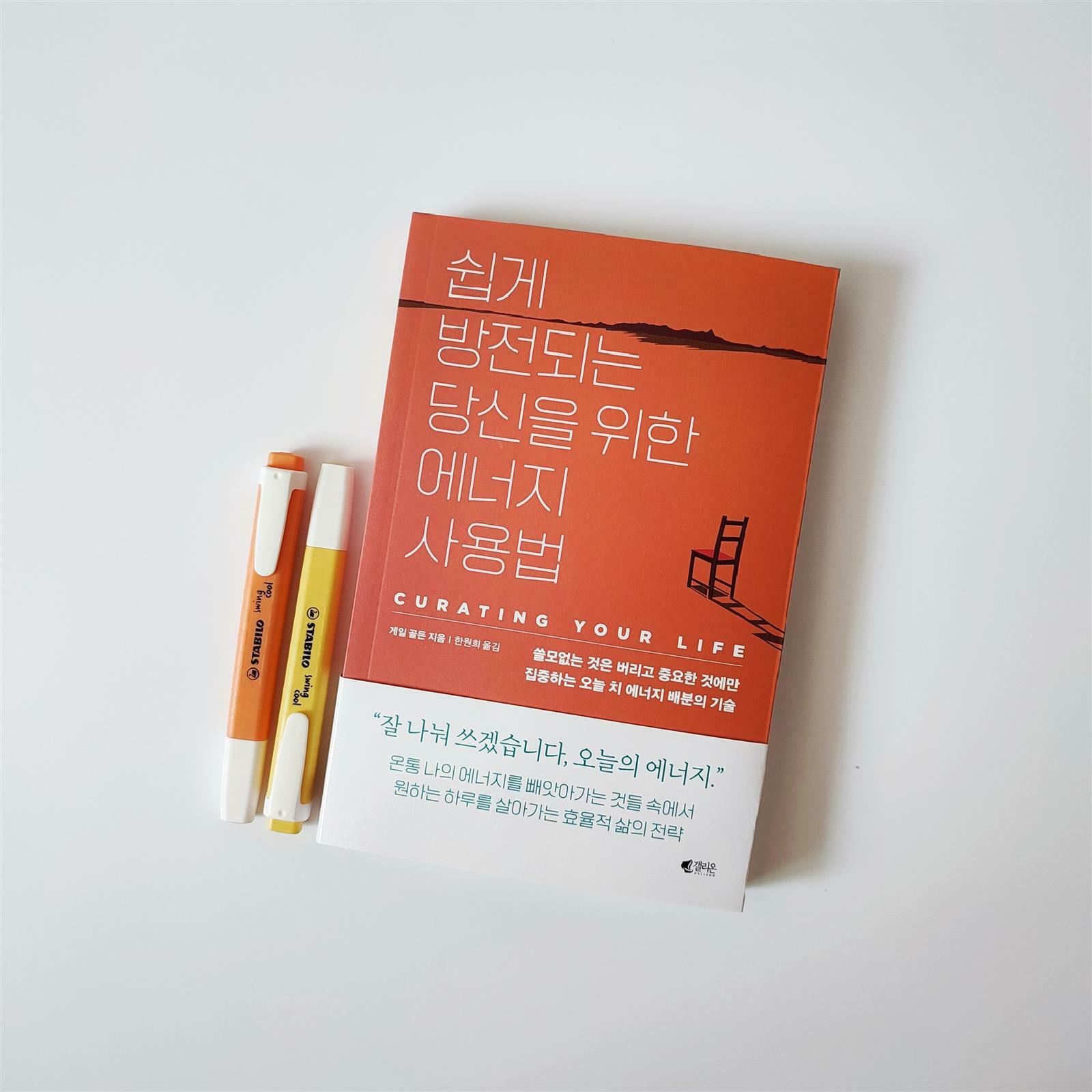 작가는 책에 소개하는 에너지 큐레이션 과정이 결코 간단한 일이 아니라고 했다. 나 또한 그 말에 공감한다. 책을 읽으며 당연하고 맞는 말에 고개를 끄덕이면서도 '그럼에도 불구하고' 이상하게 잘 안 되는 중요한 일 몇 가지가 떠올랐다. 다른 건 다 제쳐두고 그것부터 해야 하는데, 다른 일들을 미루면 그것 또한 악순환의 고리에 맞물리니까 고민이 많이 들었던 부분이었다. 우선순위에 냉정해지고, 제대로된 루틴을 만들어 가장 중요한 일은 고민 없이 실천할 수 있어야 한다. <쉽게 방전되는 당신을 위한 에너지 사용법>을 읽으며 평소 지켜온 루틴과 지키지 못한 일정을 돌아보며 어떤 방향으로 올바르게 가야 하는지 가늠해 볼 수 있었다. 어쩌면 작가의 말처럼 에너지 큐레이션은 힘들고, 많은 기술을 필요로 할 것이다. 하지만 이게 인생의 성공을 가져다주는 방식이라는 것도 진실이기에 좀 더 내 에너지를 잘 분해할 수 있도록 노력할 것이다.