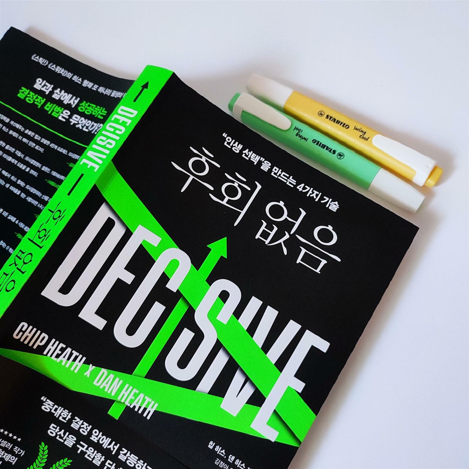 [PART1_무엇이 당신의 결정을 방해하는가]에서 결정을 가로막는 4가지 악당을 먼저 살펴본 다음, 가장 고민이 되는 파트를 보는 것이 이 책을 활용하는 좋은 방법이 되리라 생각한다. 개인적으로 [PART4_결정과 거리를 두라]에서 단기 감정을 극복하는 파트를 먼저 읽고 다른 파트를 차례로 읽었다. 책을 덮을 때 가장 도움을 받은건 [PARt5_틀릴 때를 대비하라]였지만. 선택을 할 때 '과신'해서 실패한 적은 없었다. 오히려 너무 걱정해서 문제였지. 하지만 이번 독서를 통해 알게 모르게 과신했기에 실패한 부분이 있었던 것은 아닐까... 다시 생각해보는 시간을 갖게 되었다. 내가 날 너무 과신하고 안일해지는 부분.. 좀 더 생각해 보아야 겠다. 아주 완벽한 선택은 없겠지만, 최선의 선택을 위해 나만의 프로세스를 견고히 구축하고 싶다.