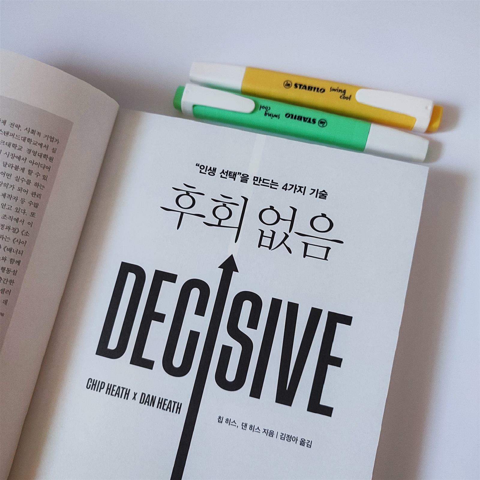 으으, 세상에 쉬운 선택은 없다지만 그 과정을 쉽고 편안하고 빠르게 만들어줄 수 있는 방법은 존재하는 거 아니겠어!? <후회 없음>을 읽으며 그동안 내 결정을 방해한 요소를 깊이 파고 들며 편협한 사고를 어떻게 벗어날 것인지, 단기 감정을 어떻게 극복할 것인지 등에 관해 돌아보았다. 그간 혼자 고민해왔던 부분에 대한 컨설팅을 받는 것만 같았달까.