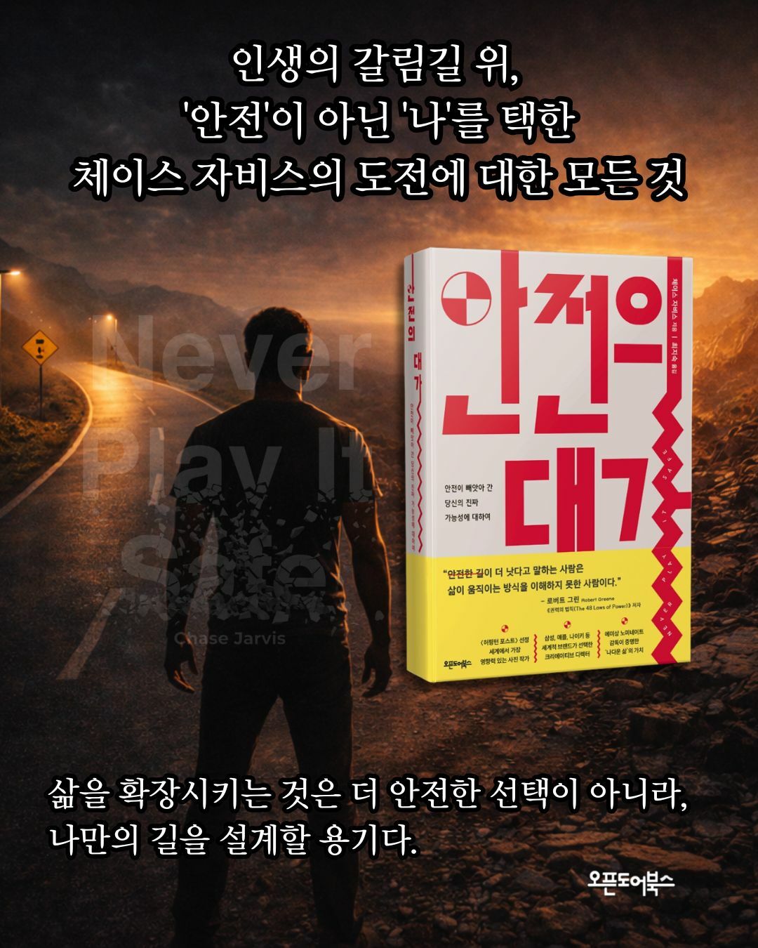 🔖 안전이 환상에 불과하다는 주장보다, 사람들이 왜 그 환상을 놓지 못하는지에 대한 시선이었다. 저자는 안전한 길을 따르는 삶의 본질을 두려움이라 말하는데, 나는 그 문장을 읽으며 쉽게 반박하지 못했다. 실제로 내 선택들 중 적지 않은 순간이 가능성보다 불안을 먼저 계산하는 방식으로 이루어졌기 때문이다. 안정적인 길은 늘 성숙하고 현명한 판단처럼 보이지만, 이 책은 그 익숙한 판단이 때로는 자기 배신이 된다고 말한다.
