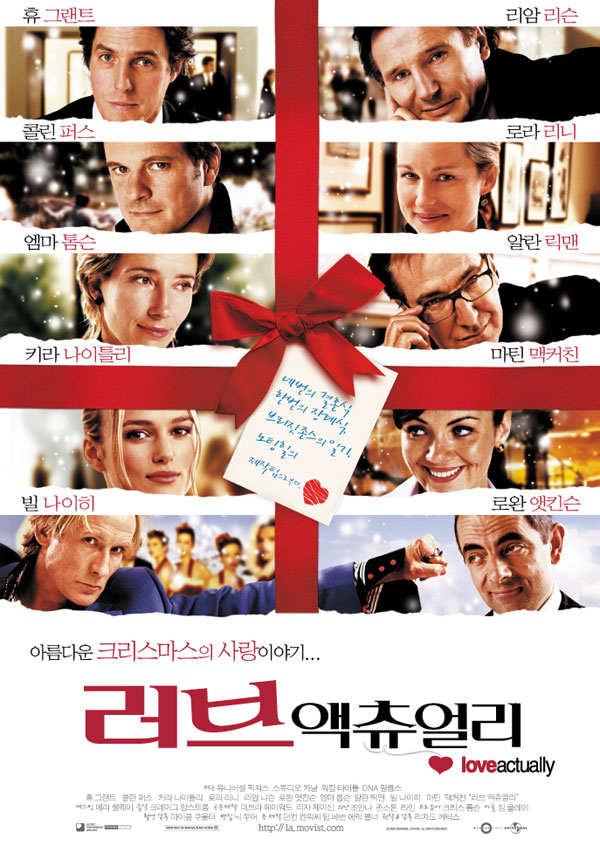크리스마스 하면 생각나는 영화는 단연 러브 액츄얼리 아닐까. 난 그런데....^^ 영국을 대표하는 배우들이 각각의 캐릭터를 잘 소화하고 있다. 여비서와 사랑에 빠지는 영국 총리, 이제 곧 미국으로 떠날 같은 반 여학생을 좋아하게 된 소년, 친구의 연인을 오래 짝사랑해온 남자, 여자친구의 배신에 낙심하다가 새로운 장소에서 새로운 사랑을 발견하게 되는 소설가 등 다양한 연애담이 멋지게 펼쳐진다.