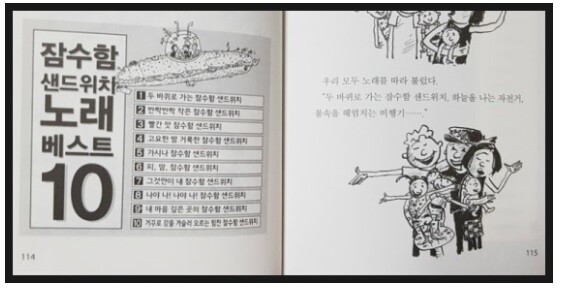 아이들에게 원곡을 들려주고 '두 바퀴로 잠수함 샌드위치'를  함께 부르는 재미와 그 뒤를 모순이 드러나는 가사들로 각색해서 부르는 또다른 재미가 더해져 단순한 재미의 책이라고 생각했던 나의 생각이 변하기 시작했다.
