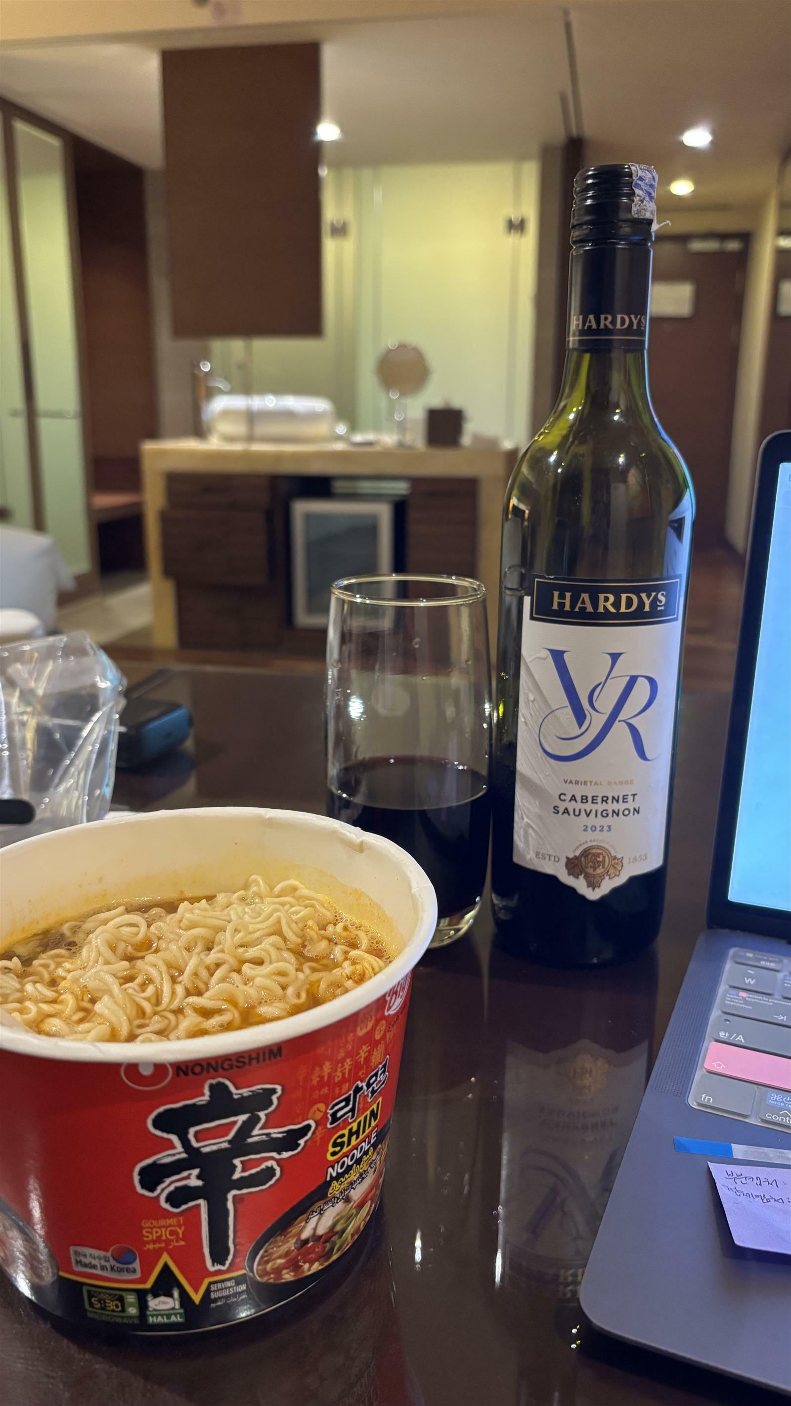 지금은 호텔방에서 신라면 컵라면에 와인을 마시면서 이 글을 쓰고 있다.