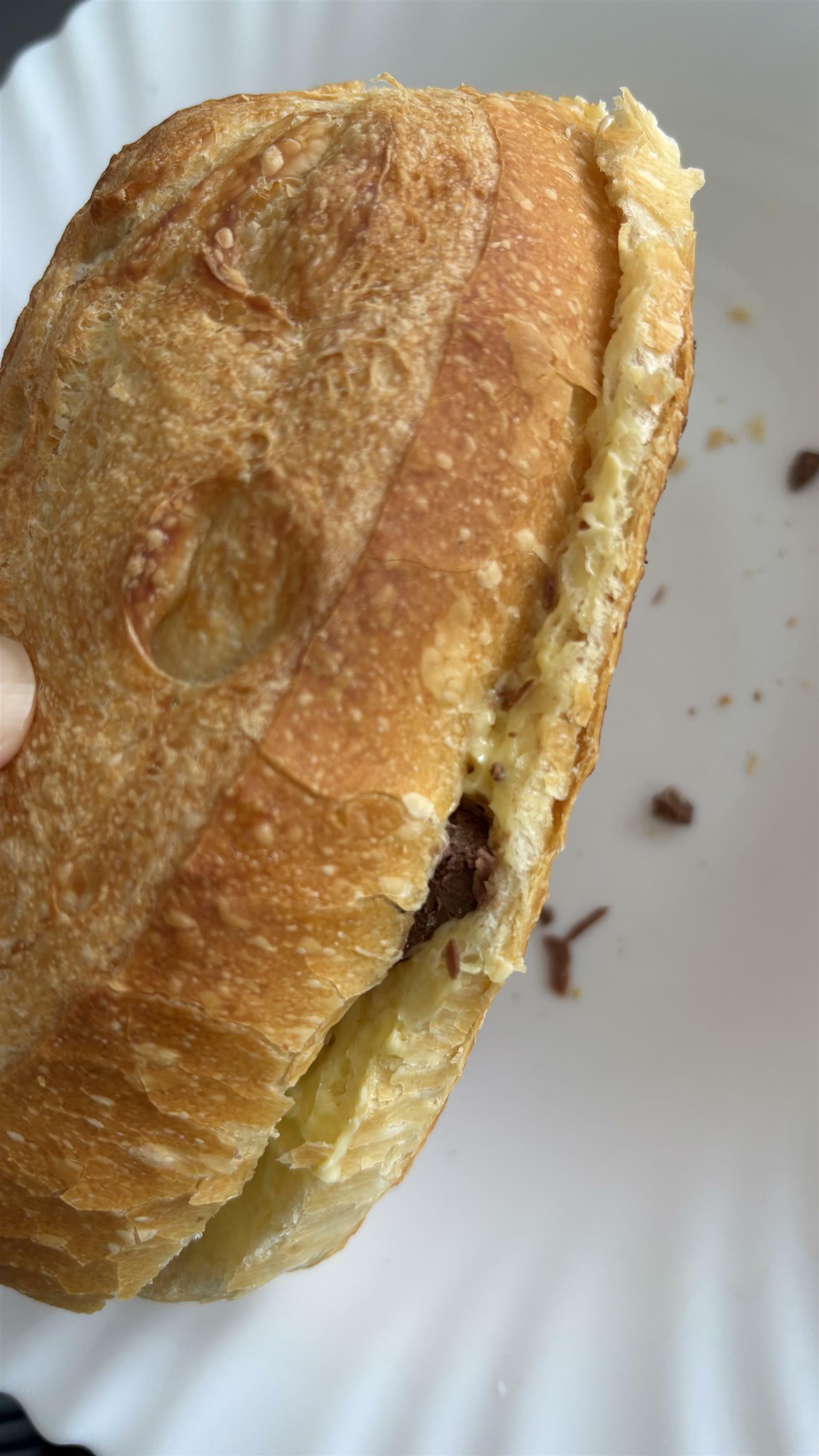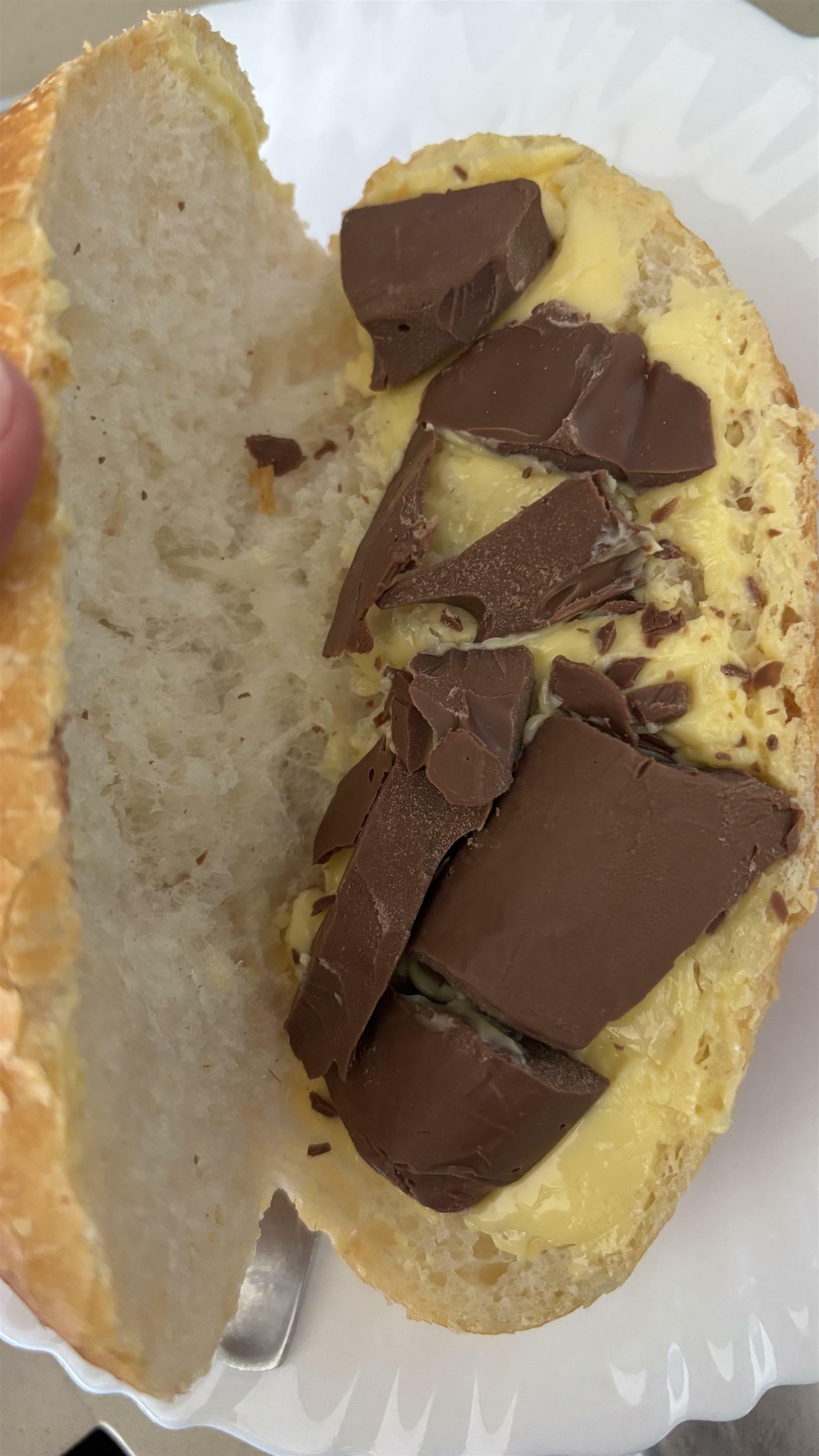 평소에 샌드위치라면 거의 90프로의 확률로 햄치즈 샌드위치를 먹는데, 이번 여행을 위해 햄치즈 샌드위치를 만들려면 햄을 또 사야했고, 그렇다면 또 햄이 남아버... 안되겠다, 있는 재료를 활용하자 생각했다. 마침 인스타에서는 '또' 바게트에 버터 넣고 초콜렛 잘라 넣는 영상을 보여줬단 말이지. 초콜렛을 대체 왜 잘라넣는가.. 라고 처음 영상 볼 때만 해도 생각했었는데, 반복해 보고 나니, 흐음 해볼까?싶어졌다. 이 빵은 반드시 바게트여야만 할 것 같았다. 식빵은 이걸 커버칠 수 없다. 나는 쇼핑몰로 갔다. 처음 간 까페에서 파는 바게트는 상당히 컸는데, 흠, 저걸 다 사면 또 남겠는데 싶어 다른 빵집을 갔다. 오, 여긴 스몰한걸 파네? 나는 그것을 사왔고, 비행기에 준비해가기에 앞서 맛이나 보자 싶어서 만들어보았다. 나의 냉장고에는 버터가 있었고, 또 친구가 미국에서 보내준 초콜릿이 있었단 말이지. 좋아, 해보는거야! 평소에 웬만해서는 초콜렛을 안먹고 어쩌다 땡길 때만 먹기 땜시롱 초콜렛이 거의 통째로 남아있었다. 나는 인스타에서 본대로 바게트의 배를 갈라 그 안에 버터를 쳐발쳐발하고 초콜렛을 부숴 넣었다.