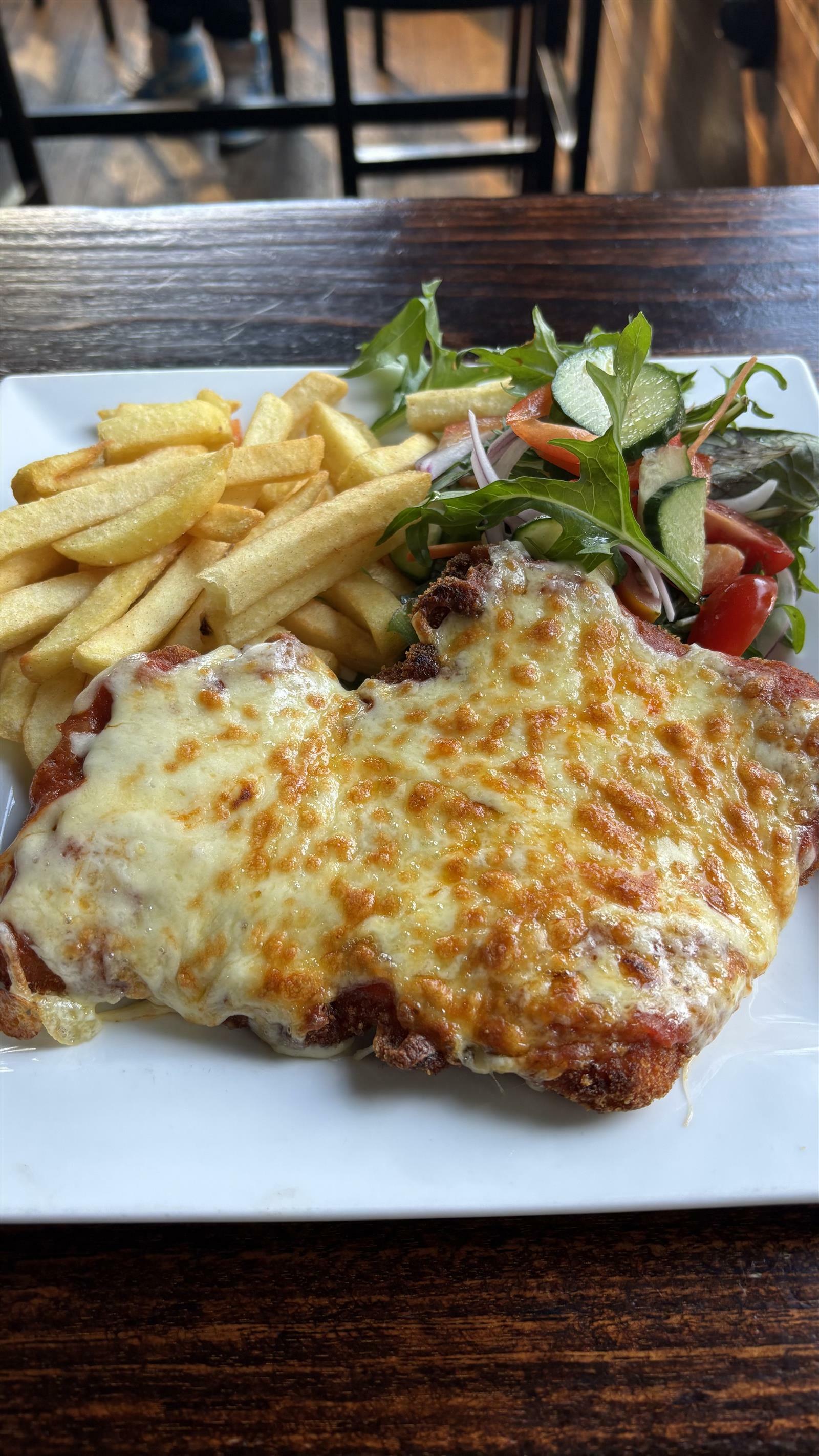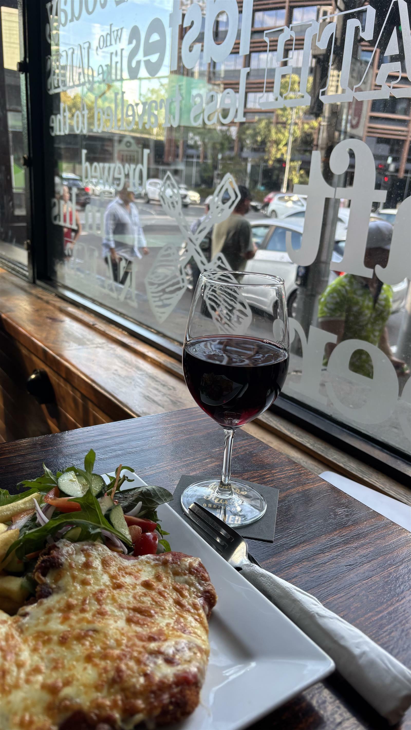 했다. ㅋㅋㅋㅋㅋㅋㅋㅋㅋㅋ너 한국어 하네? 했더니, 감사합니다 밖에 못해, 저기 근처에 커피숍 직원들이 한국인들인데 그들이 감사합니다 알려줬어. 라고 했다. ㅋㅋㅋㅋㅋㅋㅋㅋㅋㅋ하여간 그렇게 호기롭게 와인을 사가지고 호텔에 둔 뒤에, 나는 저녁을 먹으러 나갔다. 쌀국수 남겨서 배고팠어. 오늘 아침은 가져온 누룽지를 먹었고(응?) 어제 저녁 국수도 남겼어. 이렇게 허약한 채로 지낼 수 없어! 그렇게 나는 어제 찜해둔 bar 로 향했다. 가보니 이곳은 그냥 로컬인가봐요. 길에도 까페에도 아시아인들 수두룩한데 여긴 어떻게 하나도 없고, 나만 혼자 외로이 아시아인... 하여간 나는 치킨슈니첼 과 와인을 주문했다. 와인은 스몰와인 빅와인이 있는데 빅와인을 선택했다. 한 잔에 많이 따라주는 거였다.