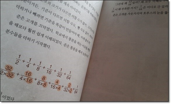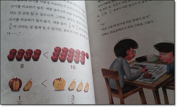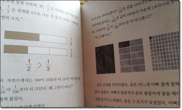 이번 수학동화에 연계된 내용은 초등 3학년부터 6학년에 걸쳐 나오는 분수와 소수에 관한 내용을 다루고 있다. 이제 4학년에 진학하는 울 딸래미는 통분과 소수점 등 아직 배우지 않은 부분에 가서는 "그게 뭐야?"라고 물어보기는 하는 등, 최소한의 관심을 보여주어서 내심 기쁜 마음이 들었다.