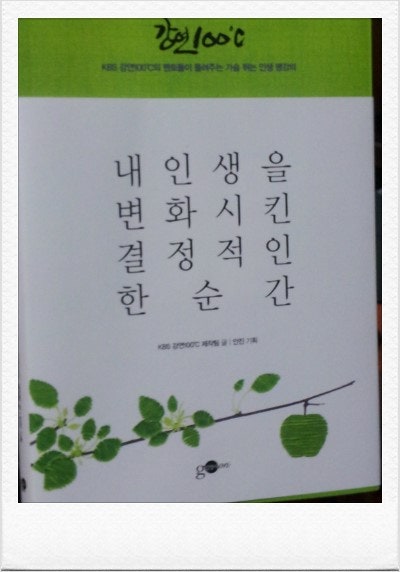 이 책 "내 인생을 변화시킨 결정적인 한순간"은 텔레비전 제목이 강연100°C이다. 물이 끓기 시작하는 끓는점의 의미와 끓기 시작해 수증기로 날아오르는 물의 변화 즉, 액체에서 기체로의 변화가 있는 온도이다. 마치 내가 지금은 물이지만 수증기가 되는 즉, 액체에서 기체로의 승화를 말할 수 있다. 내 인생을 변화시키고 싶다면 머무름이 아닌 변화가 필요하다는 말이다. 그 변화는 당연히 도전이고 용기이며 사랑이고 희망이라는 것을 23명의 삶의 체험을 통해 생생히 전달하고 있는 것이다.