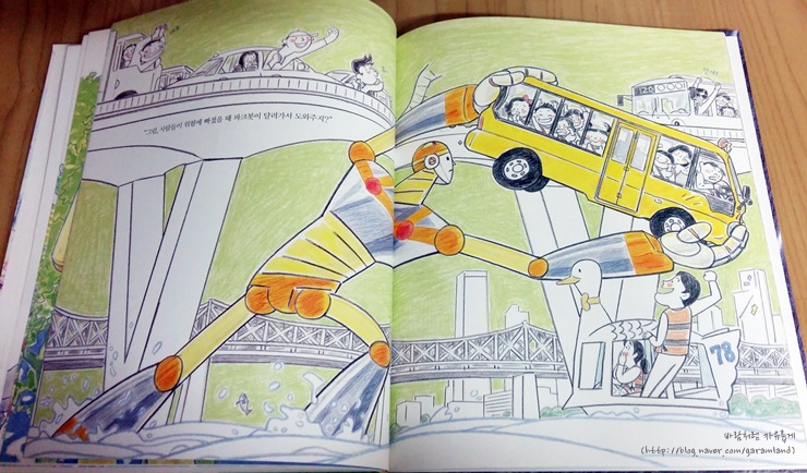로봇을 좋아하는 아이들과 함께 읽어보면 좋을 동화책이었요. 물론 책 속의 로봇인 파크봇은 공원을 관리하는 정원사 로봇이라 악당을 물리치거나 변신하지는 않지만 사람들 곁에서 늘 함께 하는 로봇의 모습을 보여주었어요. 책 속 주인공 동화도 파크봇에게 이런저런 질문을 던지며 자신의 기대에 못 미치는 파크봇에게 실망하지만 결국엔 파크봇과 친구가 되는 모습이 예쁘게 그려져 있네요. 책 속 곳곳에 서울 N 타워, 한국은행, 광화문 이순신 동상, 한강 오리 배, 타요 버스 등 서울의 전경이 그려져 있어 찾는 재미도 있었어요. 그리고 부록으로 색칠 놀이책이 있어 책을 읽고 파크봇을 색칠하며 즐거운 시간도 가질 수 있었답니다.