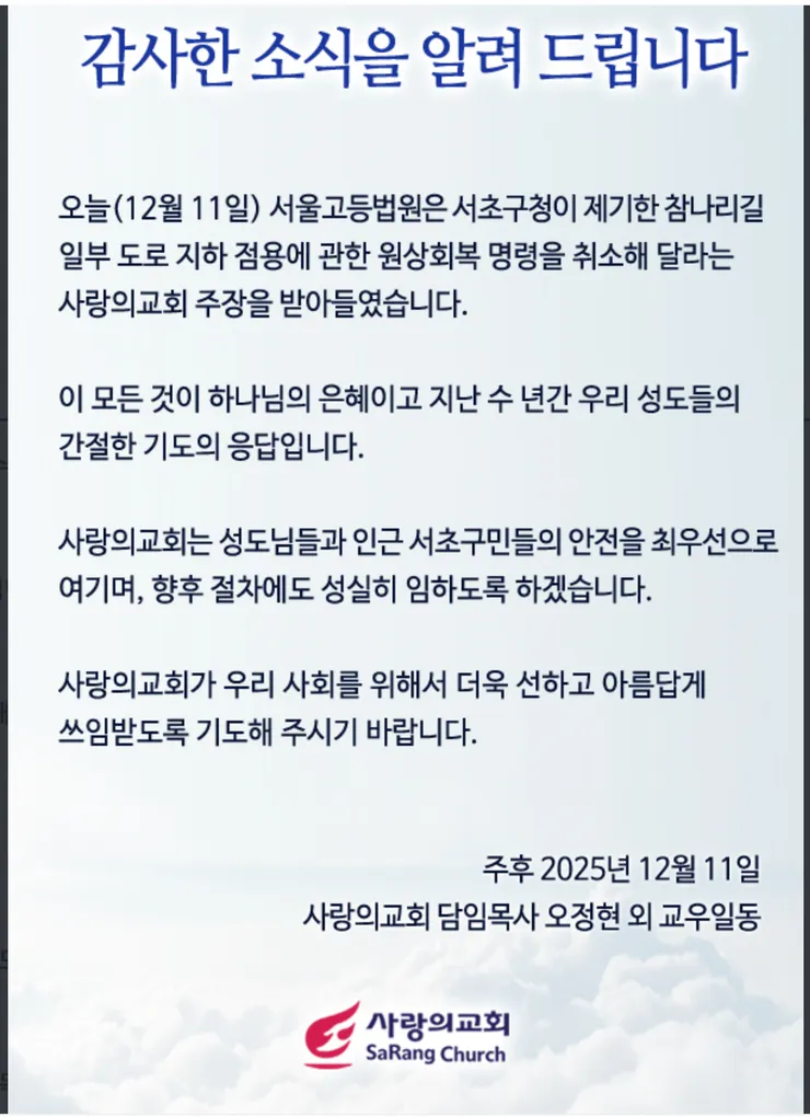 이러한 2심 결론이 나오자 사랑의교회는 홈페이지 공지로 '하나님이 기도에 응답하셨고, 하나님의 은혜다'라고 주장했다. 불법 건축이지만 너무 크게 사고를 쳐서 돌이키기 어렵다는 내용의 판결에 하나님의 이름을 들먹거리는 것이다.