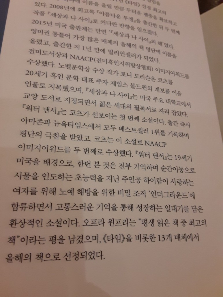 처음에는 아래 사진 설명처럼 이 소설이 19세기 미국의 노예제도에서 "사물을 인도하는 초능력을 지닌 주인공"에 대한 이야기라고 하길래, 나는 당연히 <워터댄서>가 주인공의 초능력에 초점을 맞춘, 인류의 슬픈 역사 중 하나인 노예제도에 대한 한풀이식 환타지 소설이라고 생각했다.