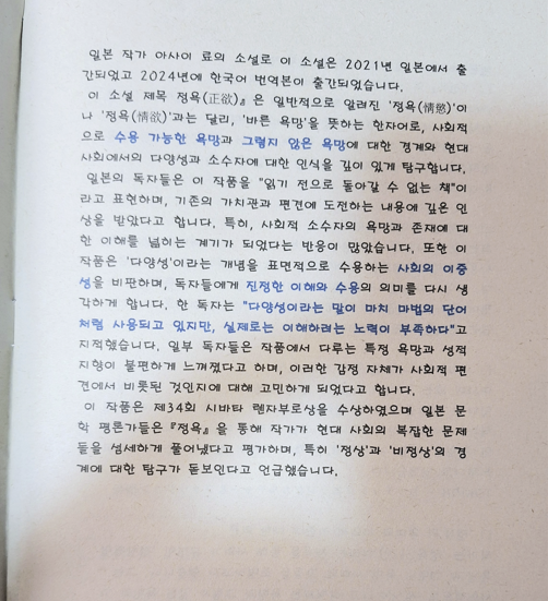아사이 료의 소설 《정욕: 바른 욕망》은 독자들을 불편하게 만듭니다. 우리는 주류에 반하는 소수의 의견과 가치관을 인정하고 존중하는 차원에서 ‘다양성’이라는 단어를 자주 사용합니다. ‘다양성’은 사회적 약자 또는 소수자를 보호하는 방패와 같은 단어입니다. 그러나 소설은 우리가 쉽게 생각하고, 때로는 착각하기 쉬운 ‘다양성’의 한계를 보여주기 위해 ‘불리한 사실’을 알려줍니다.