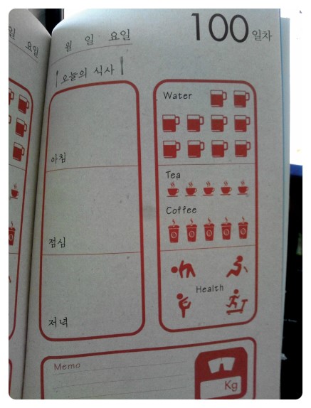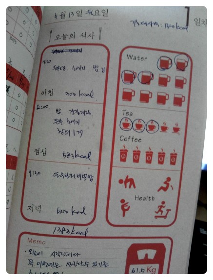 아침,점심,저녁에 무엇을 먹었는지, 물과 차, 커피는 얼마만큼 먹었는지...