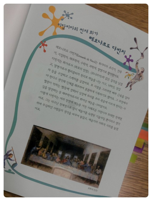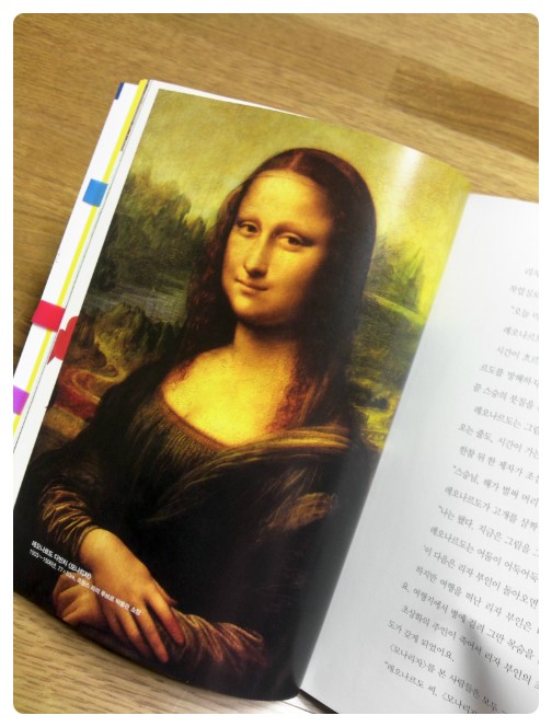 이런 일화들이 귀여운 그림과 함께 적혀있어 아이들은 레오나르도 다빈치와 그의 작품 <모나리자>를 쉽게 이해하고 기억하게 된다.