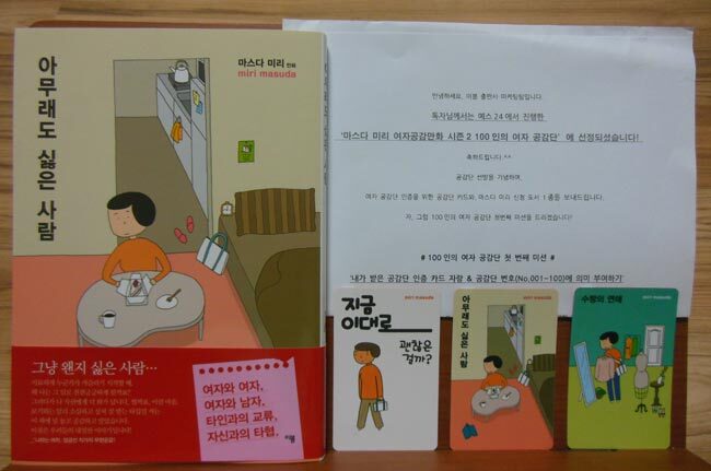 지난 이벤트에 당첨된 "마스다 미리 여자공감만화 시즌2 100인의 여자 공감단" 책과 카드가 왔기에 인증샷을 올린다. 내가 받은 책은 《아무래도 싫은 사람》!