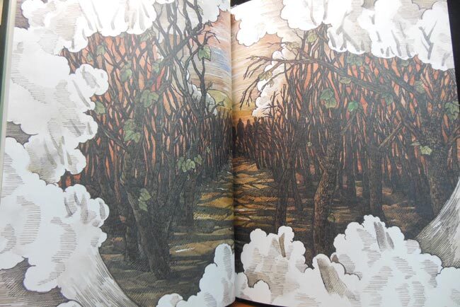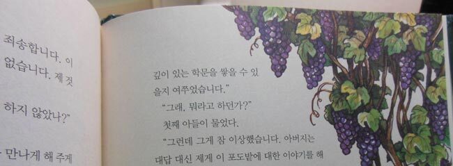 나는 우선 표지에서 압도되었다. 그림이 여느 동화책 못지 않게 고풍스러우면서도 고급스럽다. 포도 넝쿨이 앙증맞은 집과 마을을 둘러싸고 있다. 마을은 모두 세 곳인데, 이는 동화에 등장하는 세 아들처럼 성부(聖父), 성자(聖子), 성령(聖靈) 등 삼위일체를 의미하는 것으로 보인다. 표지를 열면 마치 향그런 포도밭이 펼쳐진 마을로 들어설 것만 같다. 실제로도 그랬다.