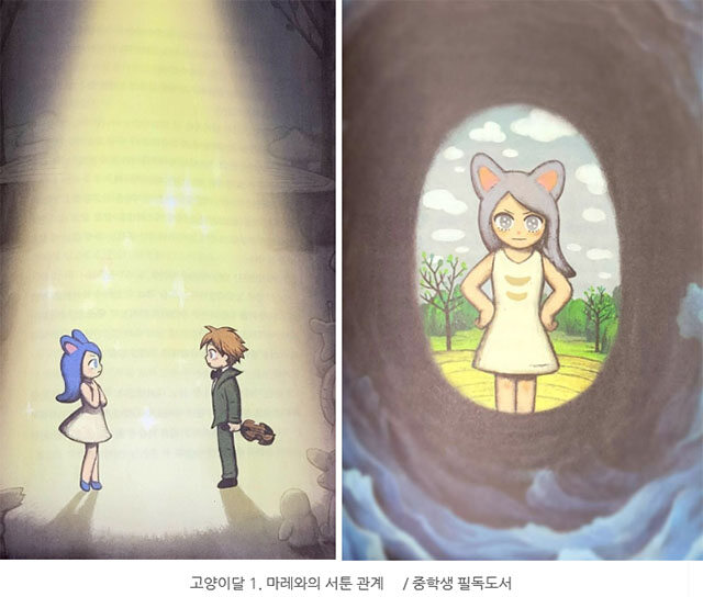 아마도 서툰 관계인것 같아요. 천진난만하게 초등생활을 하고 있는 아이들이 바로 중학생이 된다고 커버린 건 아니니까 서로 존중하고 경청하고 기다리며 같이 성장하는게 우리의 모습이 아닐까 합니다. 엄마인 나도 엄마가 처음인지라 모든 것이 서툴테고, 세상에 당당히 나서고 싶은데 그 해답이 무엇인지 몰라서 심적으로 헤메고 있는 청소년들의 모습도 무척 안타깝습니다. 내년이면 중학생이 되는 내 아이에게 추천했던 고양이달은 읽으면서도 같이 그림을 그리며 즐거운 시간을 보냈던 선물과도 같은 책이었어요. 작지만 이 소소한 행복이 바로 우리가 바라는 모습이 아닐까 생각해 봅니다.