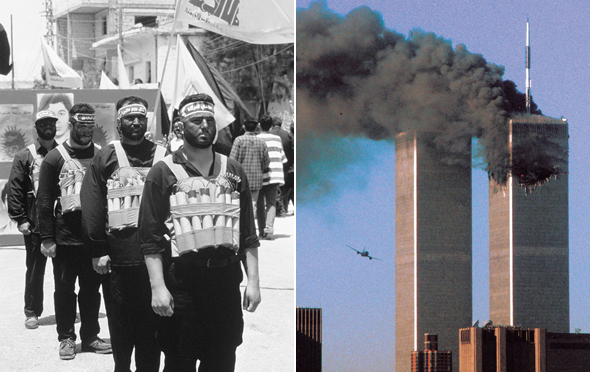 » 1996년 레바논 베이루트에서 헤즈볼라 전사들이 순교한 동지를 추모하며 자살 투쟁을 결의하는 열병식을 거행하고 있다.(왼쪽) 2001년 9월11일 오전 첫번째 테러 공격을 받아 검은 연기에 휩싸인 뉴욕 맨해튼 세계무역센터 건물에 추가 공격을 위해 두번째 항공기가 날아들고 있다. 한겨레출판, 로이터 뉴시스 제공