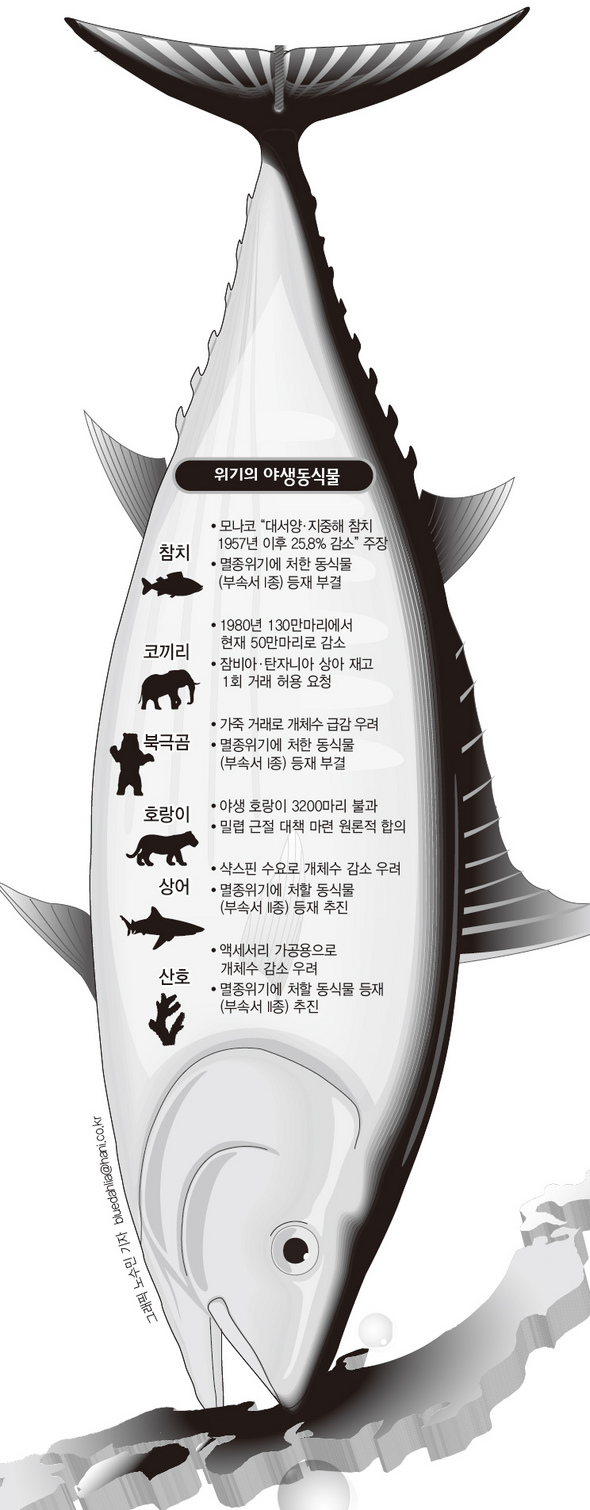 지난 18일 이번 회의 최대 관심사였던 대서양·지중해산 참다랑어 거래 금지안은 압도적인 표차로 부결됐다. 이를 부결시키려는 일본에 개도국들과 중국이 가세한 결과다. 중국과 일본이 샥스핀과 마구로(참치)라는 자국 ‘식탁’을 위해 협조했다는 해석도 나온다.