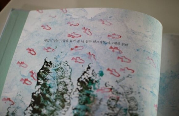 책을 넘기자 기존에 먼저 나와있던 타 출판사의 책에 없던 헌사가 눈에 띕니다. 레오 리오니의 친구 '알프레도 세그레' 가 헤엄이의 이름을 붙여주었나봅니다. 그림책의 본문으로 들어가지 않아지만 레오 리오니 특유의 수채기법과 모양을 새긴 후 찍어낸 작은 물고기와 바다 생물들의 모습이 눈에 들어옵니다.