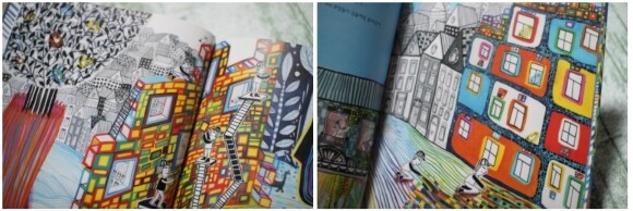 책에서 나는 강렬하게 대비되는 나만의 색 - 훈데르트바서의 것과 항상 비슷했던 색깔들-을 사용하여 그림을 그렸다. 나는 살아 움직이는 듯한 오래된 도시의 지붕, 거리와 외벽의 모자이크, 체스판의 체크무늬를 그렸다. <중략>