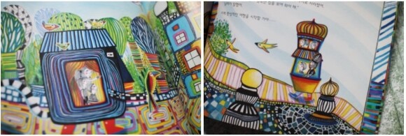다채로운 색으로 가득한 일러스트 속에는 훈데르트바서의 건축물들이 오마주되어 곳곳에 담겨있다. 여러가지 빛깔의 자갈이 거리를 따라 흐르고, 벽에는 온갖 색들이 빛을 내며, 파도처럼 미끄러지는 선과 모자이크로 그려진 나선이 사방에 감긴다. 그의 나선형 그림들은 '식물적 회화법'이라는 독특한 작업방식으로 그렸다고 한다. ‘시작과 끝이 정해져 있지 않고 끝없이 돌고 도는 나선은 우리의 삶과 가장 많이 닮아 있다’고 말했던 훈데르트바서의 말도 떠오른다.