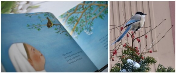 그림 속 다양한 새들을 바라본다. 꽃이나 나무 이름에 비해 새 이름을 조금밖에 몰라 새들에게 미안하다는 수녀님은 그 이름을 불러주어야 할 것 같다고 했다. 나도 집 근처의 새들을 보며 종종 그런 생각을 한다. 아파트 현관 근처의, 눈 쌓인 산수유 나무 위에 남은 산수유 열매를 먹는 이 새를 최근 많이 만난다. 얼마 전에야 '물까치' 라는 것을 알았다. 수녀원 언덕길에서 자주 마주치는 가슴이 노란 새의 이름이 궁금해서 조류 사전을 빌려다보았다는 그녀의 글을 보며 함께 미소를 짓게 된다.
