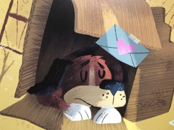 파란색 우체통 앞에서 기다리는 미지의 인물. 편지를 물고 달려오는 아피의 표정이 환하다. 아피의 꼬리는  기쁨으로 팔랑거리고 있다.