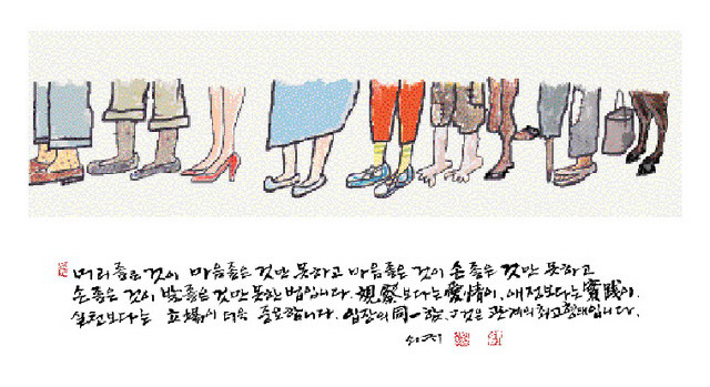 머리좋은 것이 마음좋은 것만 못하고 마음좋은 것이 손좋은 것만 못하고 손좋은 것이 발좋은 것만 못한 법입니다. 觀察보다는 愛精이, 애정보다는 實踐이, 실천보다는 立場이 더욱 중요합니다. 입장의 同一함, 그것은 관계의 최고형태입니다. ( 서화출처 : 더불어숲, 신영복홈페이지, http://www.shinyoungbok.pe.kr/ )