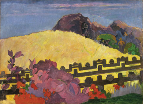 고갱의 '신성한 산'. 타히티에 위치한 어느 신전을 그린 그림이라는데 꼭 숨은그림찾기를 해야 할 것 같이 풍경에서 토끼의 모습도 보이고, 사람의 머리 형상도 보인다.