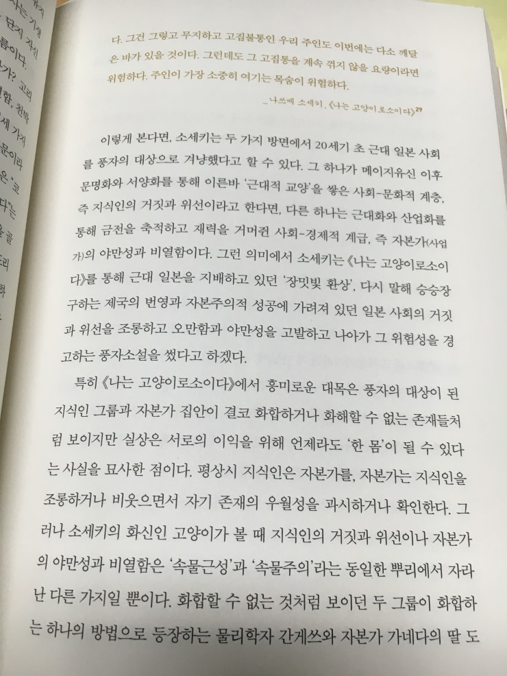 풍자 라는 분야가 조선에서도 상당히 혁신적인 일이었음을 다룬 후 여기서는 일본에서 비슷하게 나타나는 것을 이야기 하는데 특히 소세키의 책을 들어서 그만의 개성을 바라본 '속물주의'에 대한 통렬한 일침을 말한다. 대개 사람들이 표현형을 보는데 급급해서 그 근본적인 것을 보지 못하는 경우가 많은데, 위대한 작가들은 내면의 진실을 투명하게 투영하는 능력이 있는 것 같다.