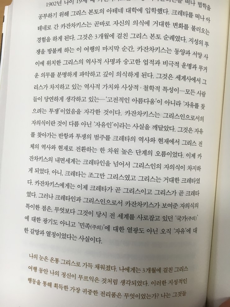 내게 인생책 중 하나인 <그리스인 조르바>를 쓴 카잔차키스의 이야기가 나온다. 놀랍게도 그는 저 예전 민족주의 국가주의가 매우 강맹하던 시절에 그에서 벗어난 '자유'에 대한 이야기를 써내려갔다고 한다. 그의 자의식 그게 곧 개성이면서 자신의 글쓰기를 완성해 주는 최고의 무기가 아니었을까?