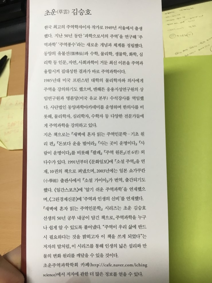 확실히 주역을 열심히 보신, 주역에 대한 전문가신 듯 하다. 이 책의 가장 큰 특징이 (개인적으로 읽으며 느낀 바로) 아~주 쉽게 풀었다는 것이다. 그 쉬운게 어느 정도냐면 마치 아는 어른이 내게 이야기를 그냥 전해주는 느낌?